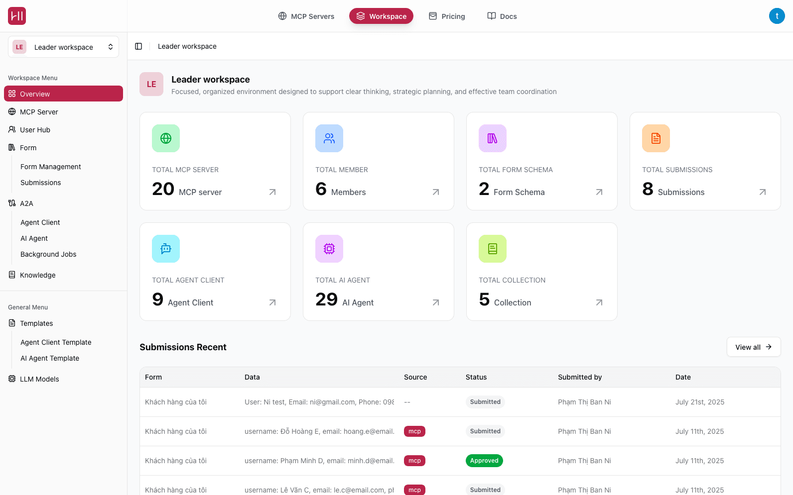 HiAGI cho phép người dùng tạo, cấu hình và quản lý nhiều máy chủ MCP qua giao diện trực quan. Mỗi máy chủ hoạt động như một cầu nối thông minh giữa AI của bạn và các nguồn dữ liệu ngữ cảnh.